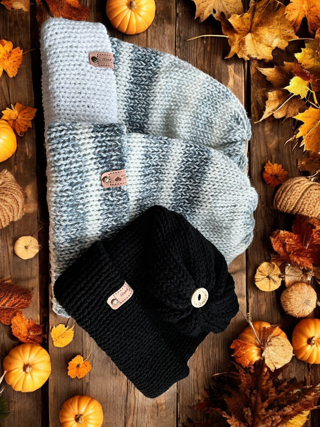 Handmade Knitted beanie hats, with a button on the top. Designd to be reversable.