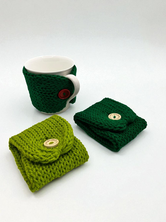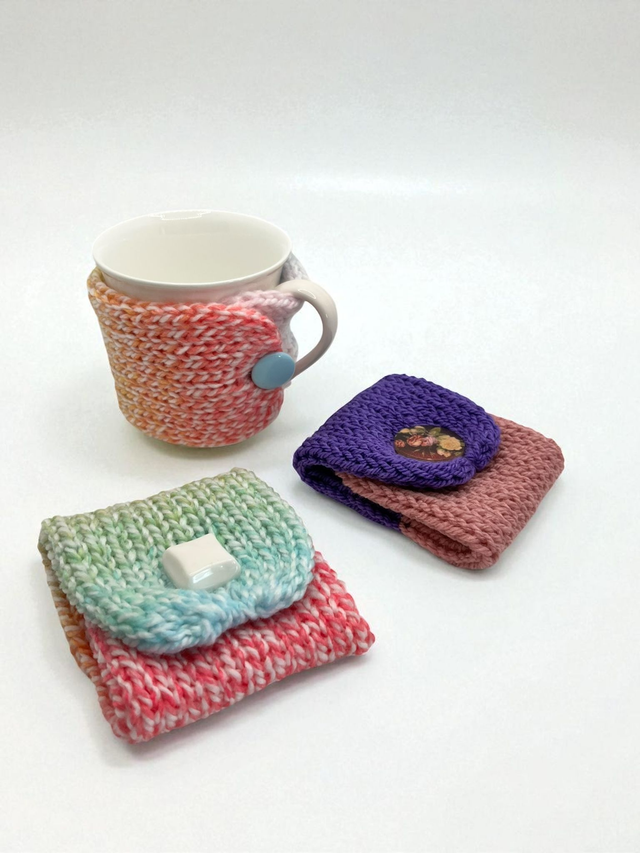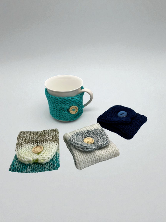 Handmade knitted cup wraps with button.